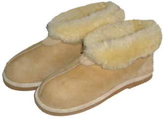 These durable sheepskin slippers have a suede outer finish and a tough composite foam sole for both indoor and outdoor wear. Real sheepskin fleece runs throughout the entire inside of the slipper. These come in the light tan color as shown and are available in